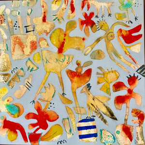 43 x 43cm. Acrylic paint, polymer paint, oil pastel and ink wash on on canvas. Framed in sustainable oak timber