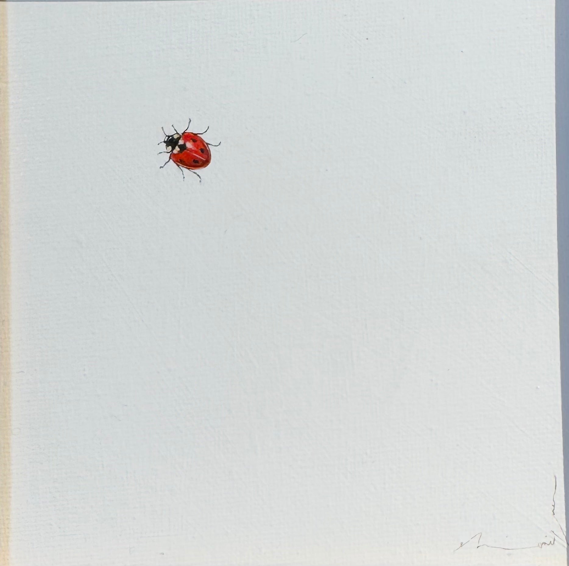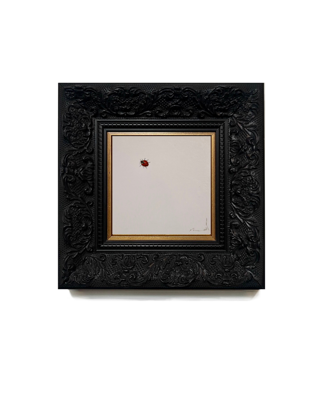 Purposeful use of negative space serve to highlight the delicate beauty of the tiny ladybird. An ornate frame further adds to the artwork.