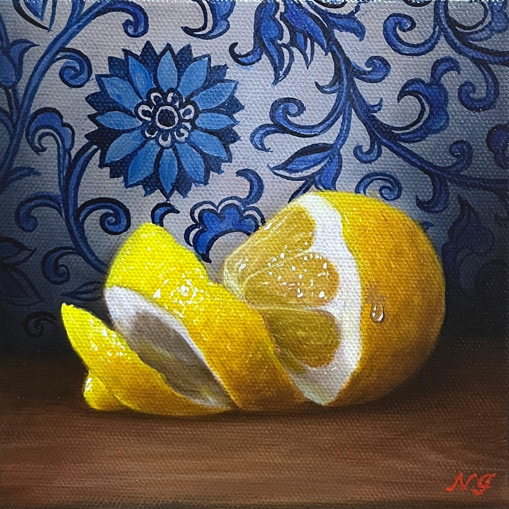 This surreal still-life painting captures a delicately peeled lemon, its spiral rind revealing glistening, juice-filled segments. Set against an ornate blue floral wallpaper, the contrast between the vivid yellow of the lemon and the cool, intricate background evokes a sense of introspection—bitterness wrapped in beauty.