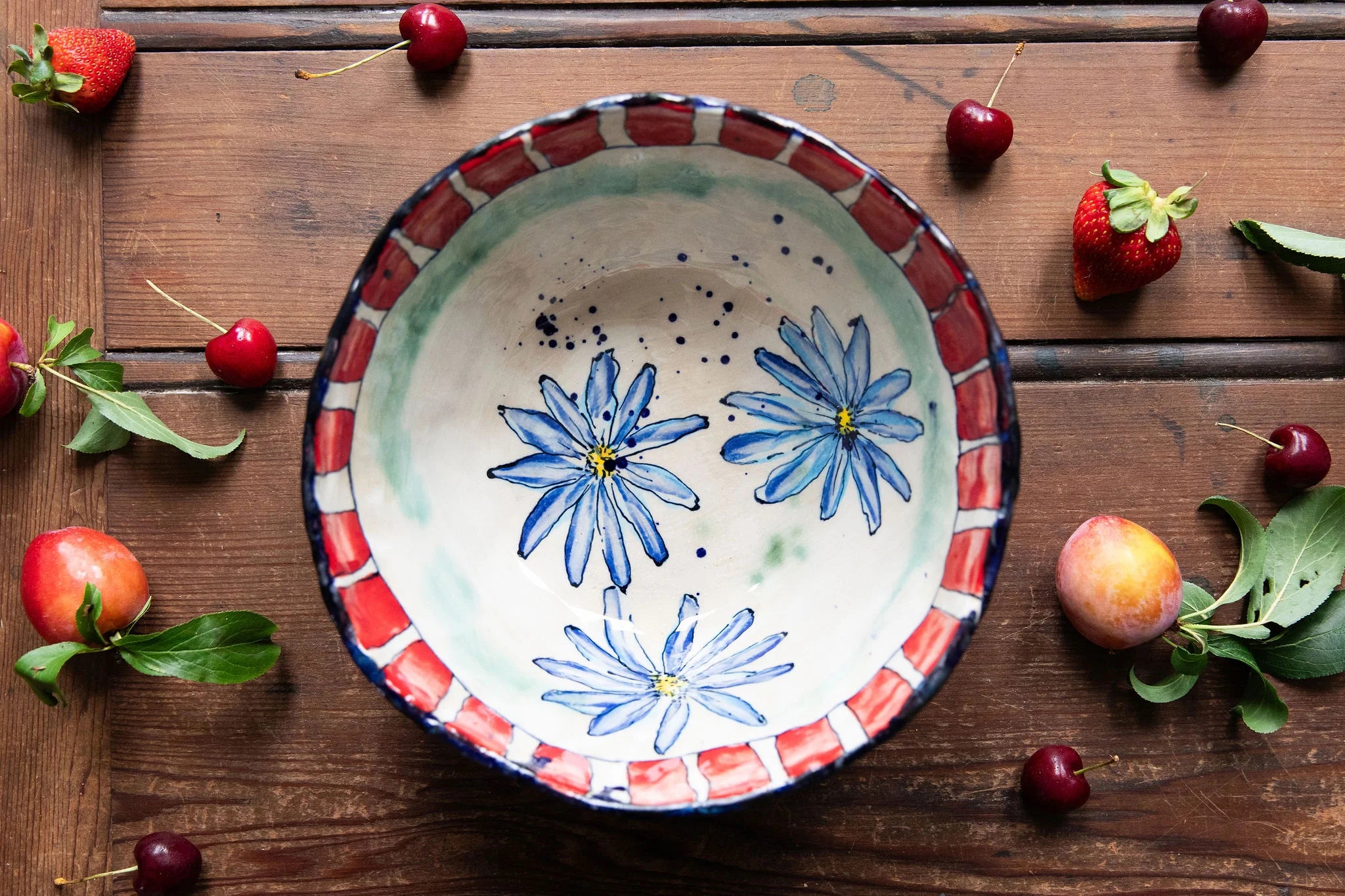 Medium: Hand-built and hand painted glazed stoneware ceramic, food safe, water tight, dishwasher safe, handwashing recommended. Signed and dated on the bottom and on the decorated surface.