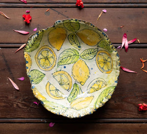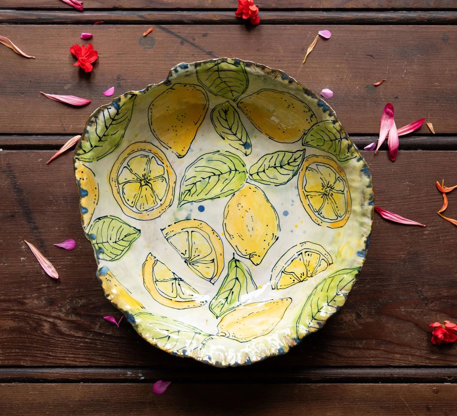 Medium: Hand-built and hand painted glazed stoneware ceramic, food safe, water tight, dishwasher safe, handwashing recommended. Signed and dated on the bottom and on the decorated surface.