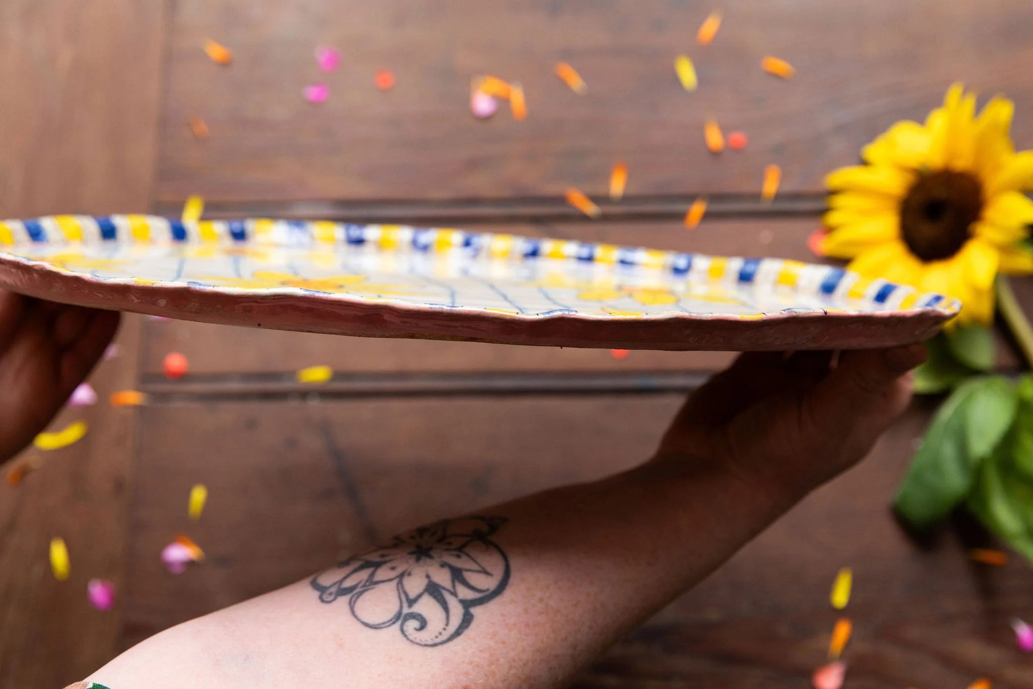Medium: Hand-built and hand painted glazed stoneware ceramic, food safe, water tight, dishwasher safe, handwashing recommended. Signed and dated on the bottom and on the decorated surface.