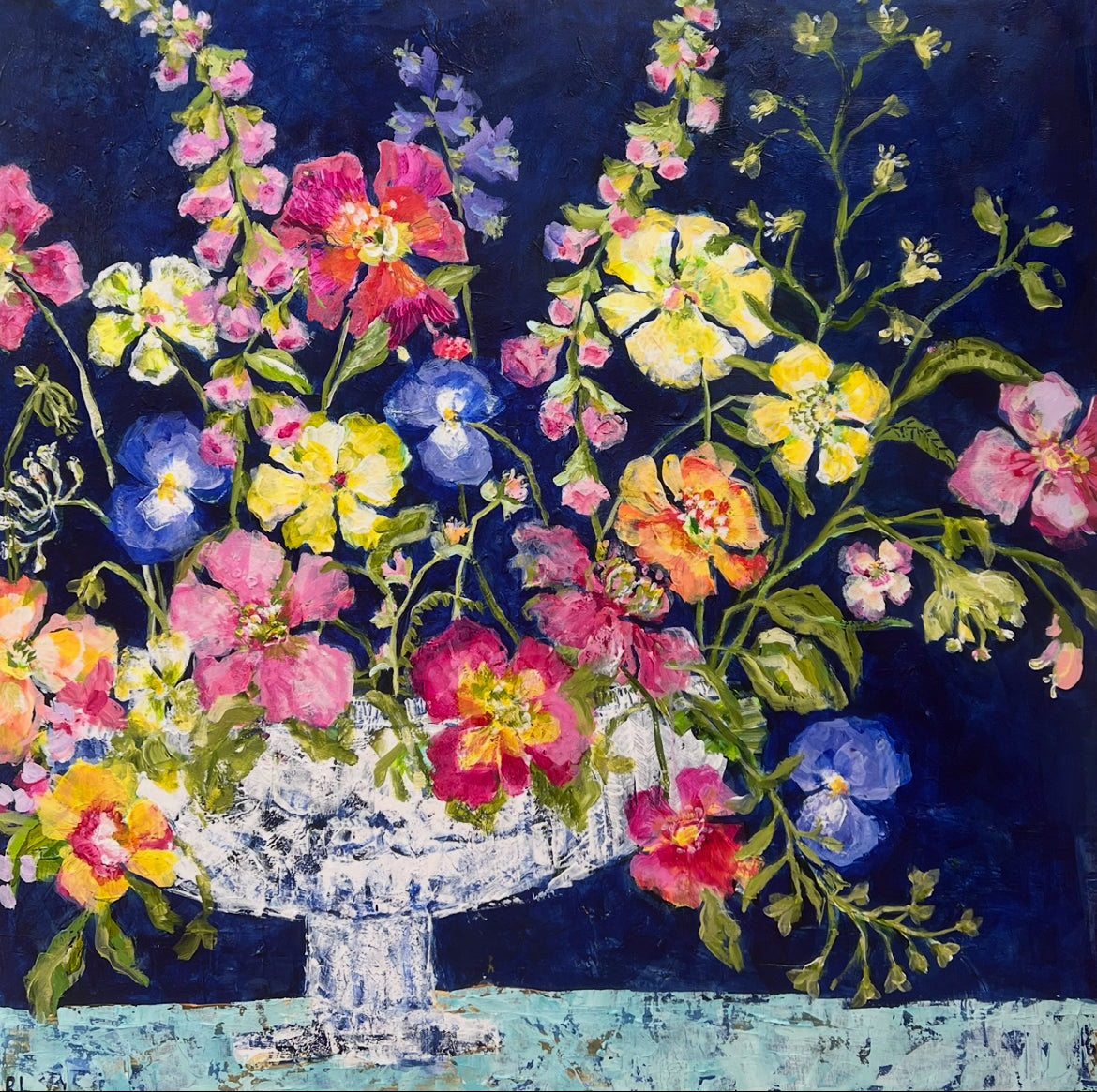 I paint floral abstracts because I love building layers of illuminated acrylic colours. The vessels are gently textured and layered with shades of colour poking through. Flowers’s are my splashes of fun and colour and that’s where I get to play. My flowers are on the quirky side of things. You are left guessing what sort of flowers they might be. I’m painting intuitively, using loose brush strokes, scratchings and the feeling from colours.