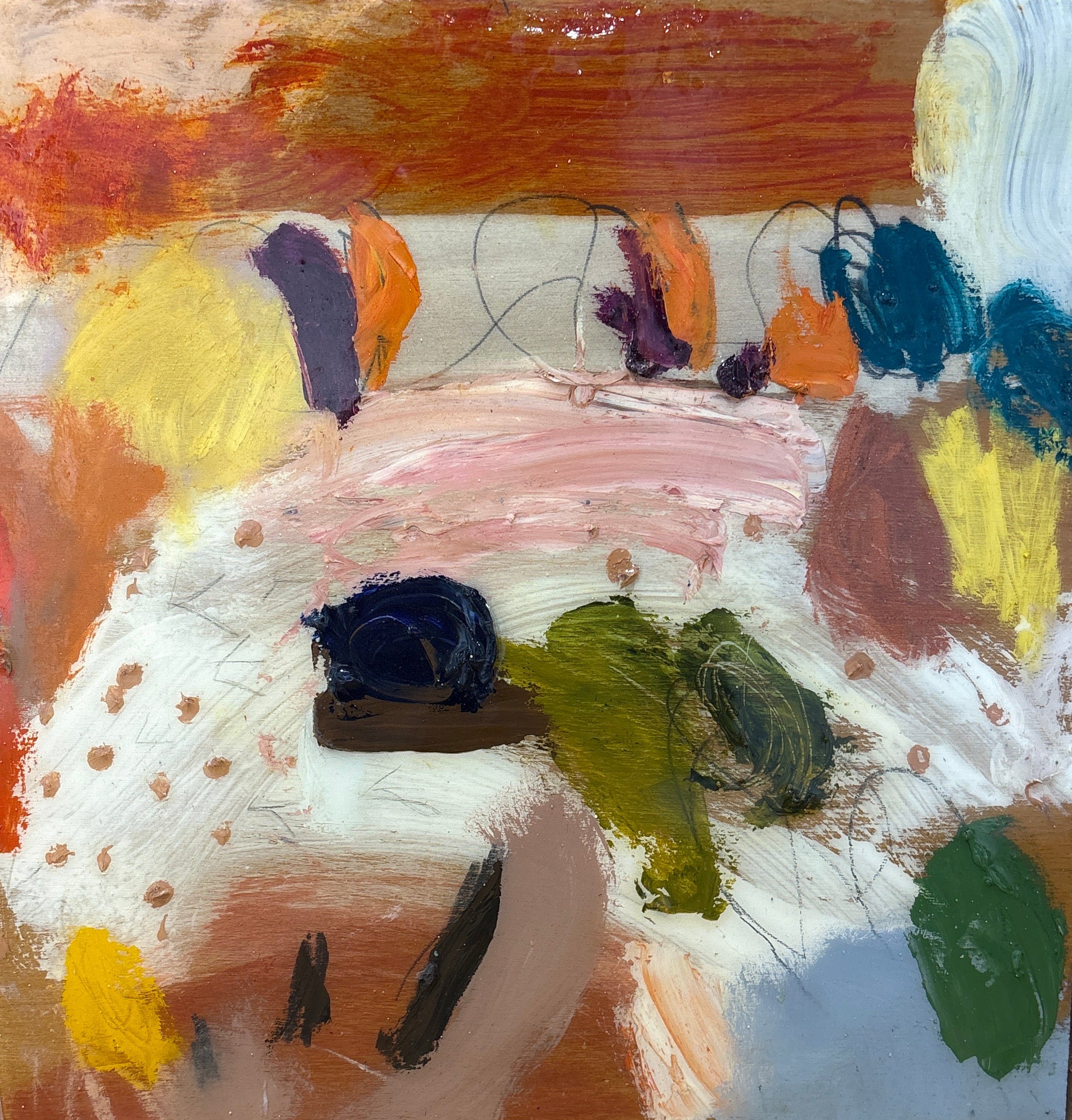 Raphe’s works are delightfully layered with colour and energetic marks. With pops of red, yellow and purple echoing blooming flowers, sweeps of blue indicating moving water and delightful scrawling’s of bird flight paths taking the viewer on a dance around the surface. The immediacy of the mark making is key here, building on the dynamics and energy of the work creating a thrilling zing of life, intimacy and emotional punch.