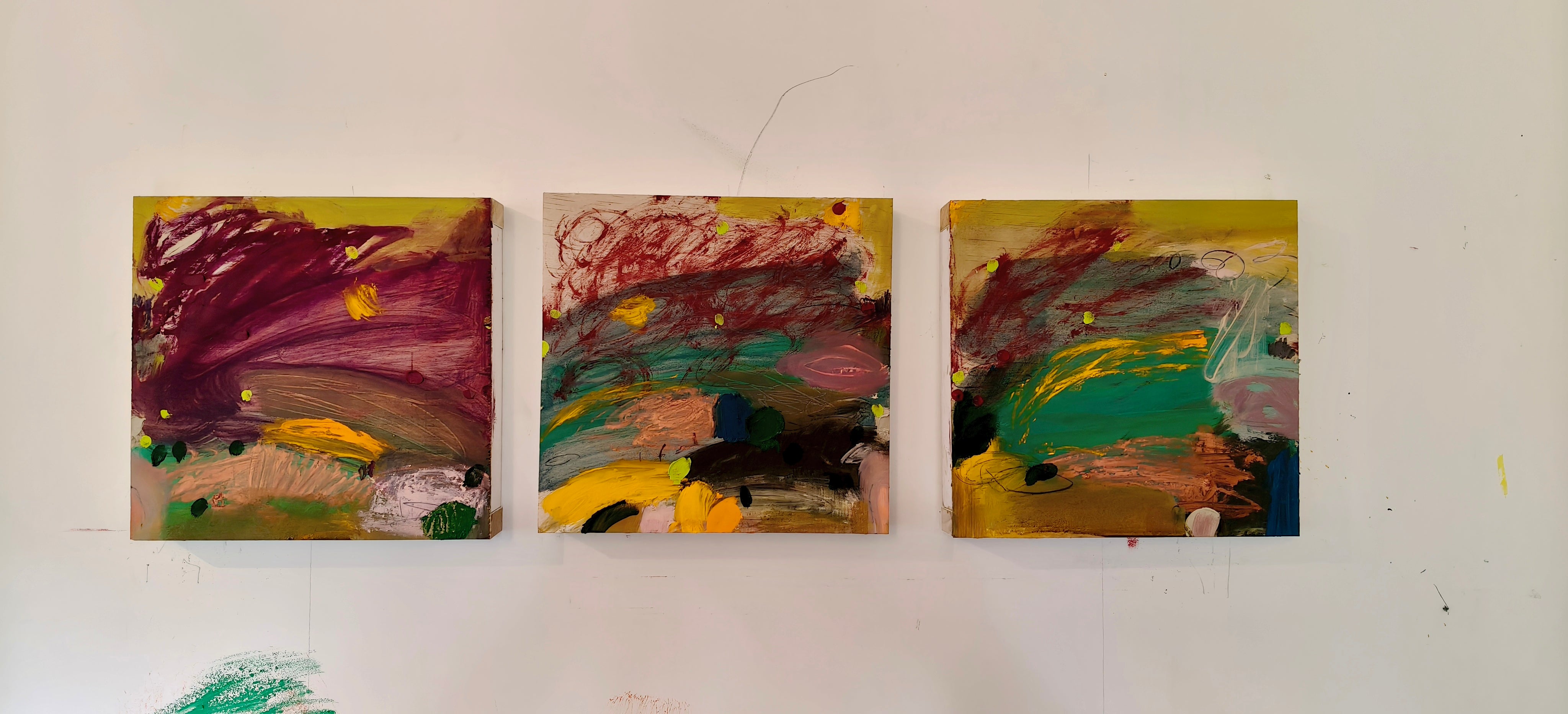 Raphe’s works are delightfully layered with colour and energetic marks. With pops of red, yellow and purple echoing blooming flowers, sweeps of blue indicating moving water and delightful scrawling’s of bird flight paths taking the viewer on a dance around the surface. The immediacy of the mark making is key here, building on the dynamics and energy of the work creating a thrilling zing of life, intimacy and emotional punch.