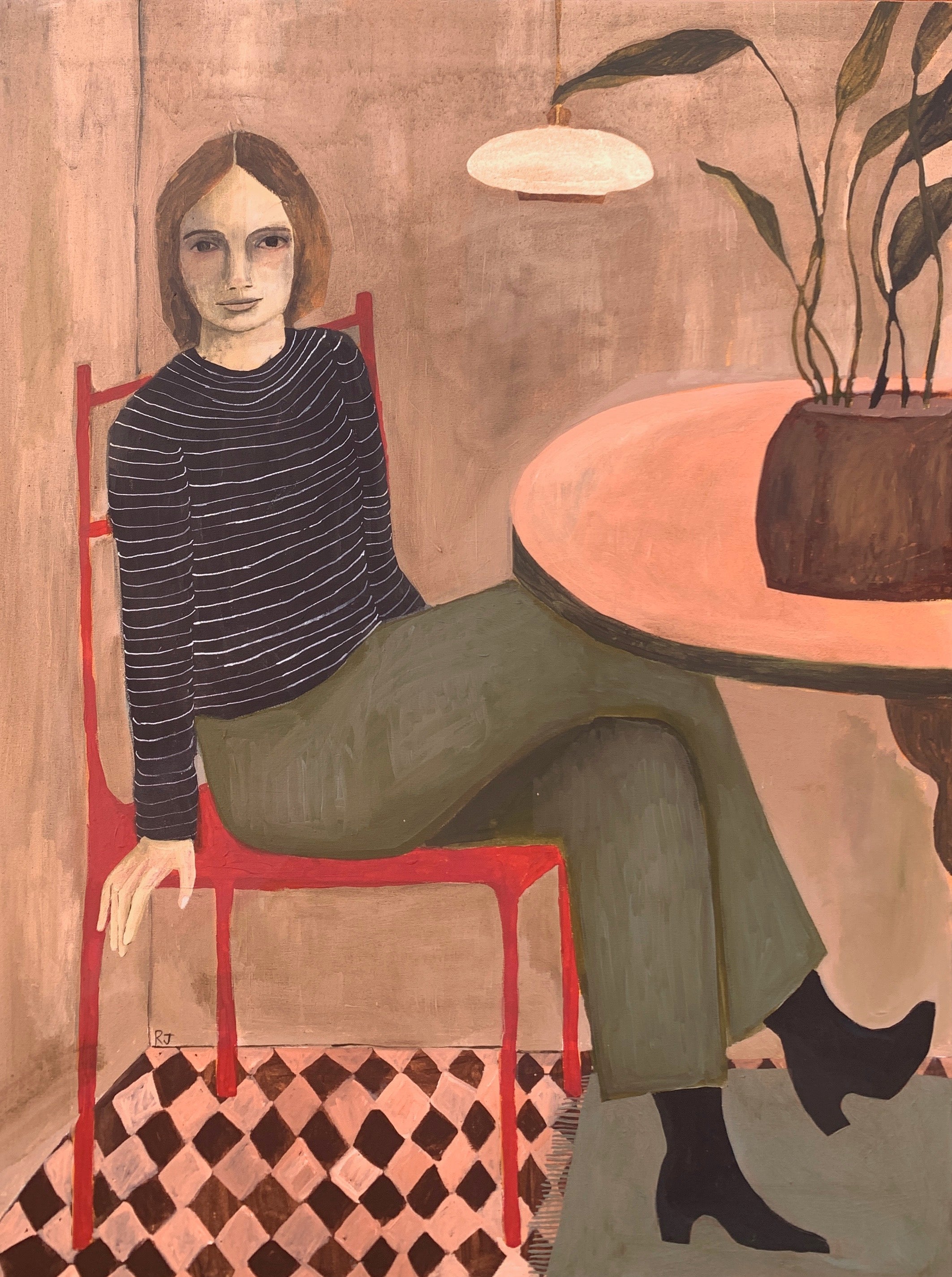 Rebecca is inspired by the work of both contemporary and classic artists and creates her paintings by first imagining a scenario or feeling. She then looks through old photos, magazine pictures and online images of people to help inspire the composition and form of her painting. Once she’s got a composition on the canvas she works and reworks her paintings, layering the paint and sometimes scraping back and adding or removing elements to the composition until she has a piece she’s happy with.