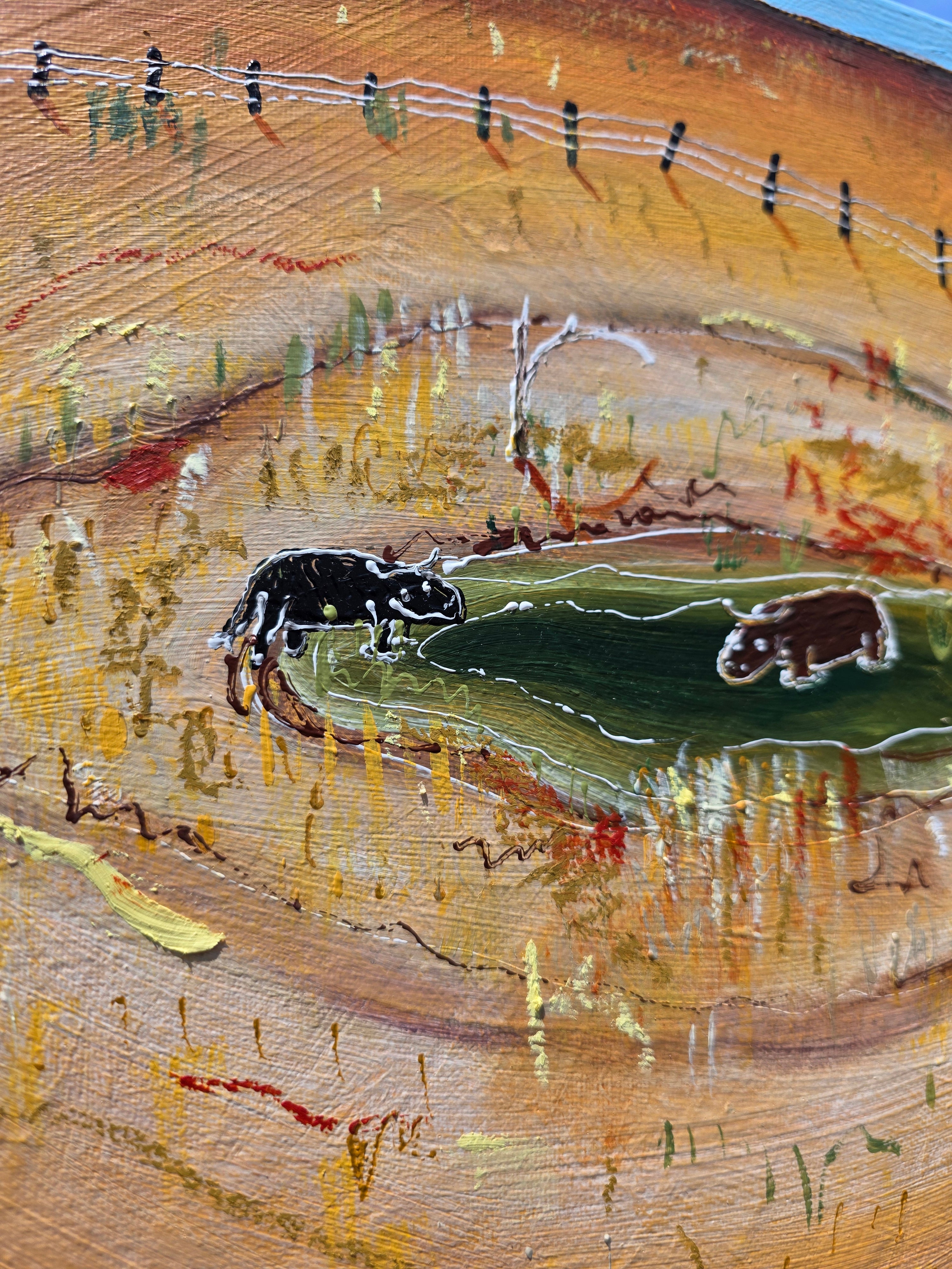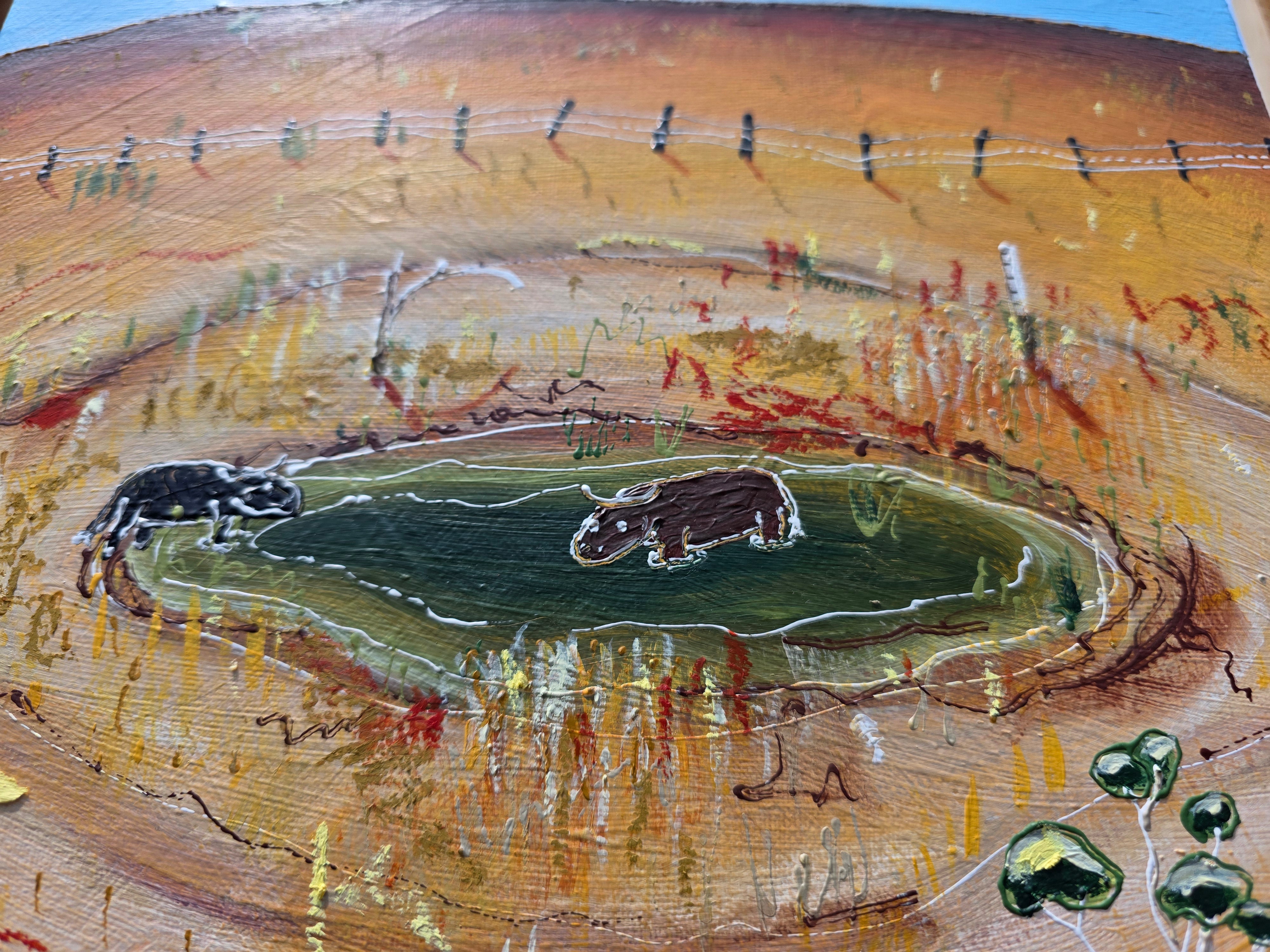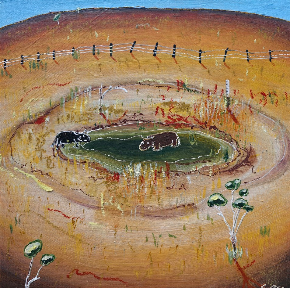 I hear people around where I live speak about the extreme weather they encounter on a day to day basis. One moment it's flooding the next it's bone dry for weeks on end. There never seems to be a happy medium, I guess that why after a while all you can do is try and laugh at it. This work reflects some of the funny stories I hear shared about those times. I wonder if cows view whats left of a dried up Dam like an oasis in the desert?