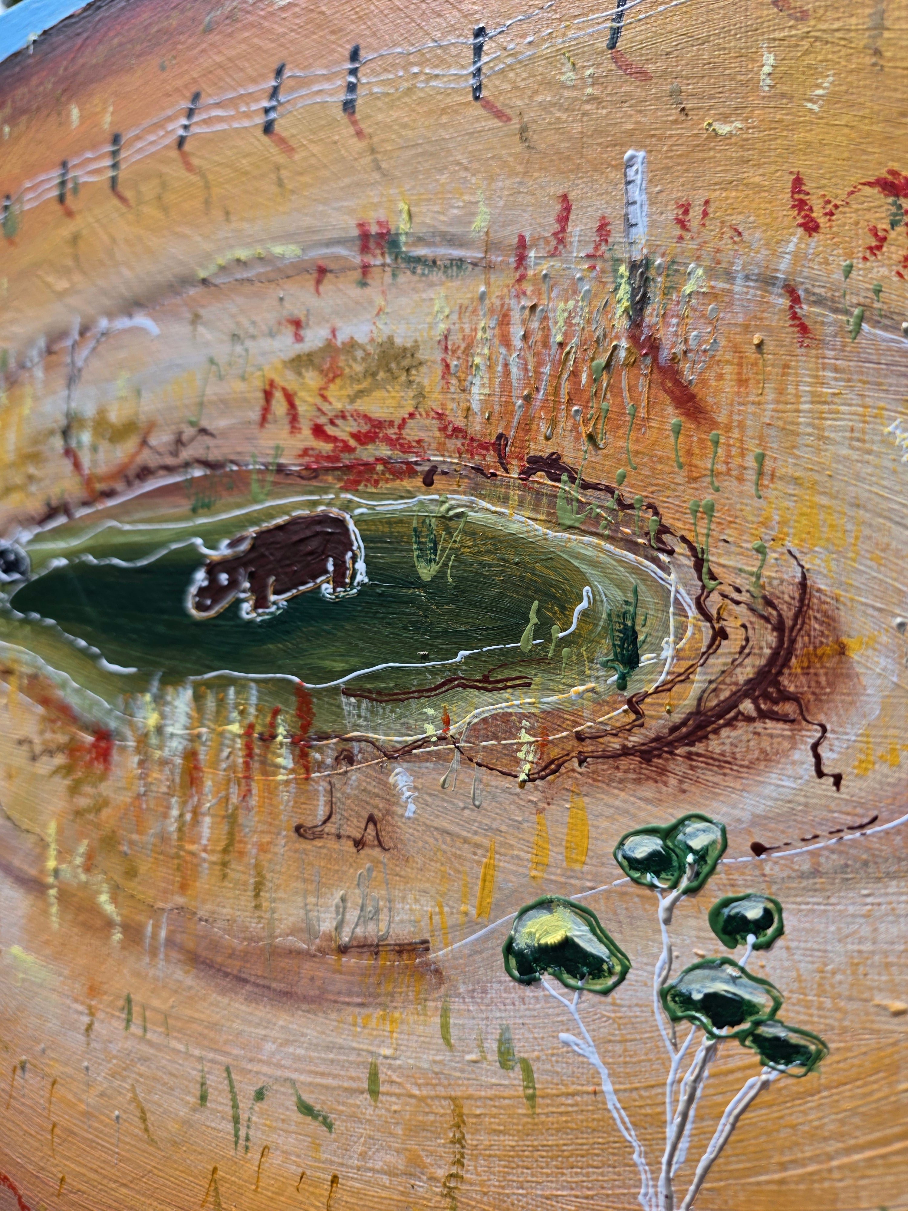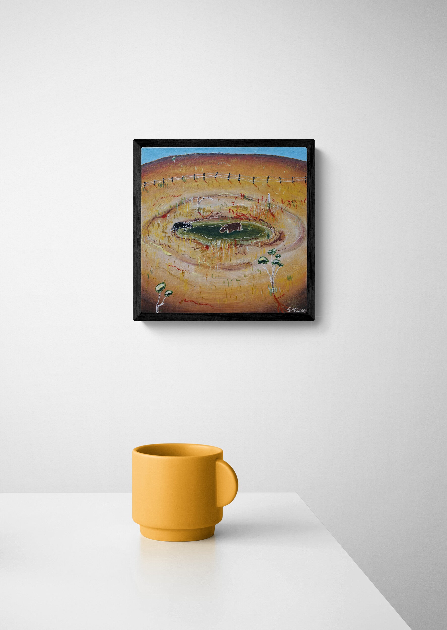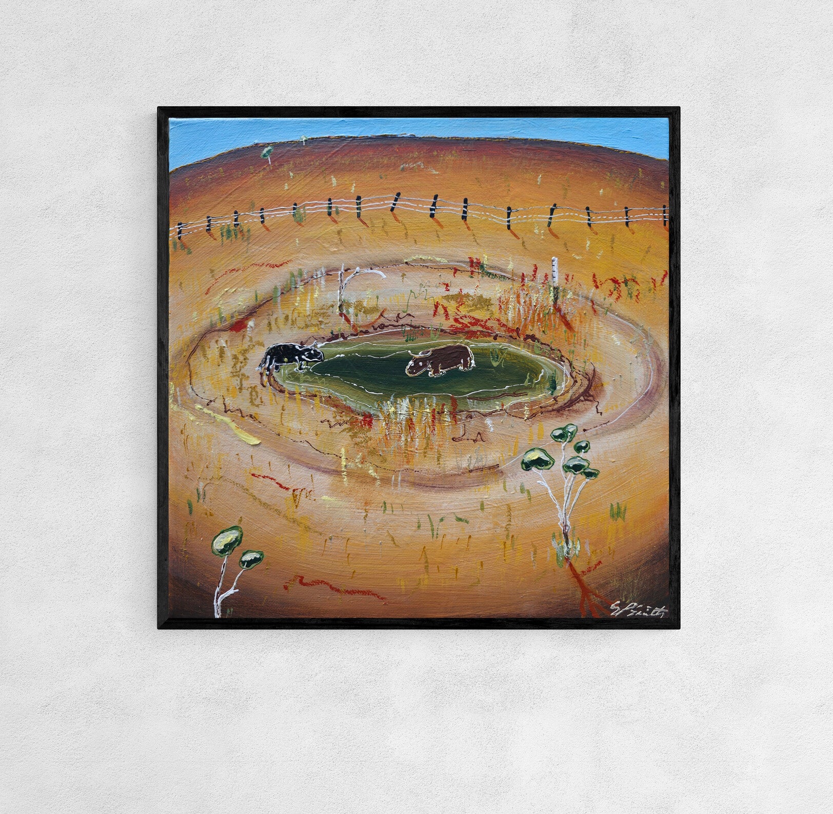 I hear people around where I live speak about the extreme weather they encounter on a day to day basis. One moment it's flooding the next it's bone dry for weeks on end. There never seems to be a happy medium, I guess that why after a while all you can do is try and laugh at it. This work reflects some of the funny stories I hear shared about those times. I wonder if cows view whats left of a dried up Dam like an oasis in the desert?