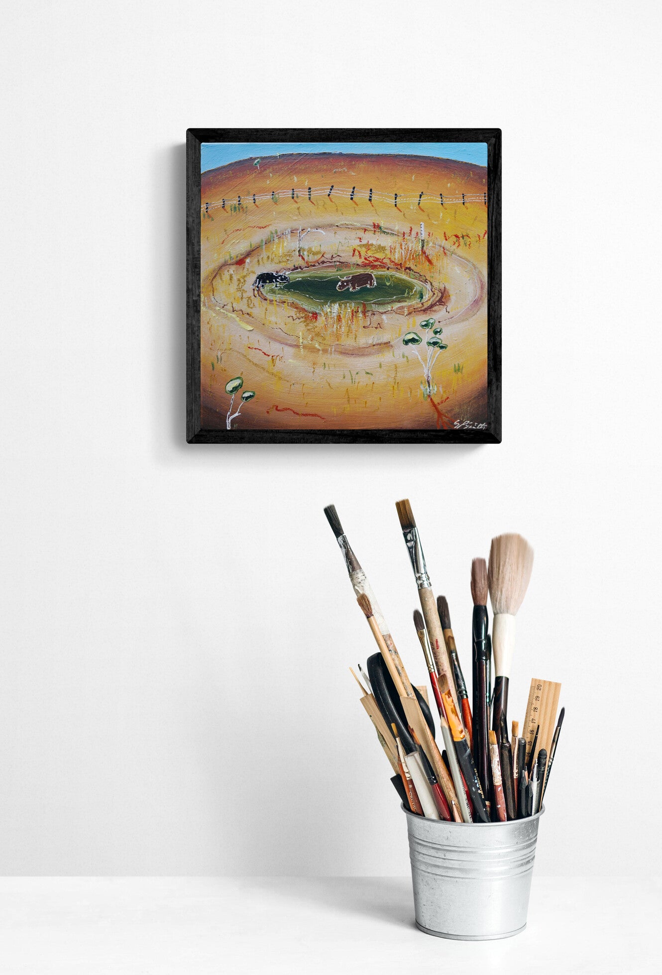 33 x 33cm | Acrylic and oil stick on canvas | Framed in black stained timber | Ready to hang