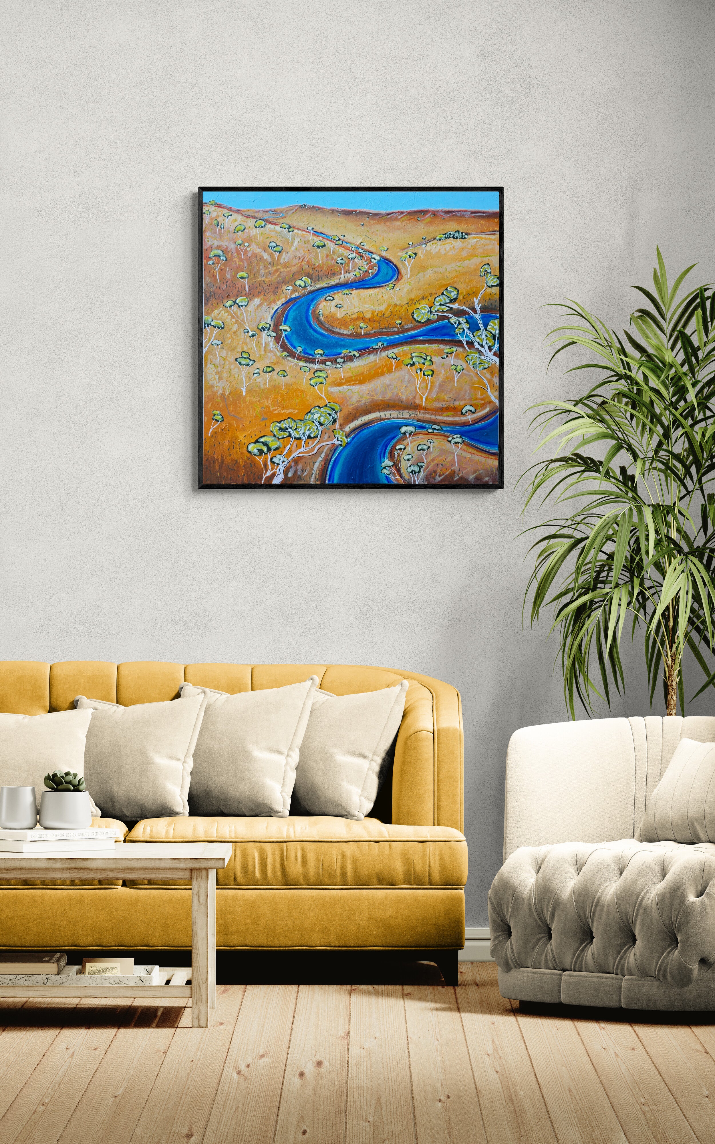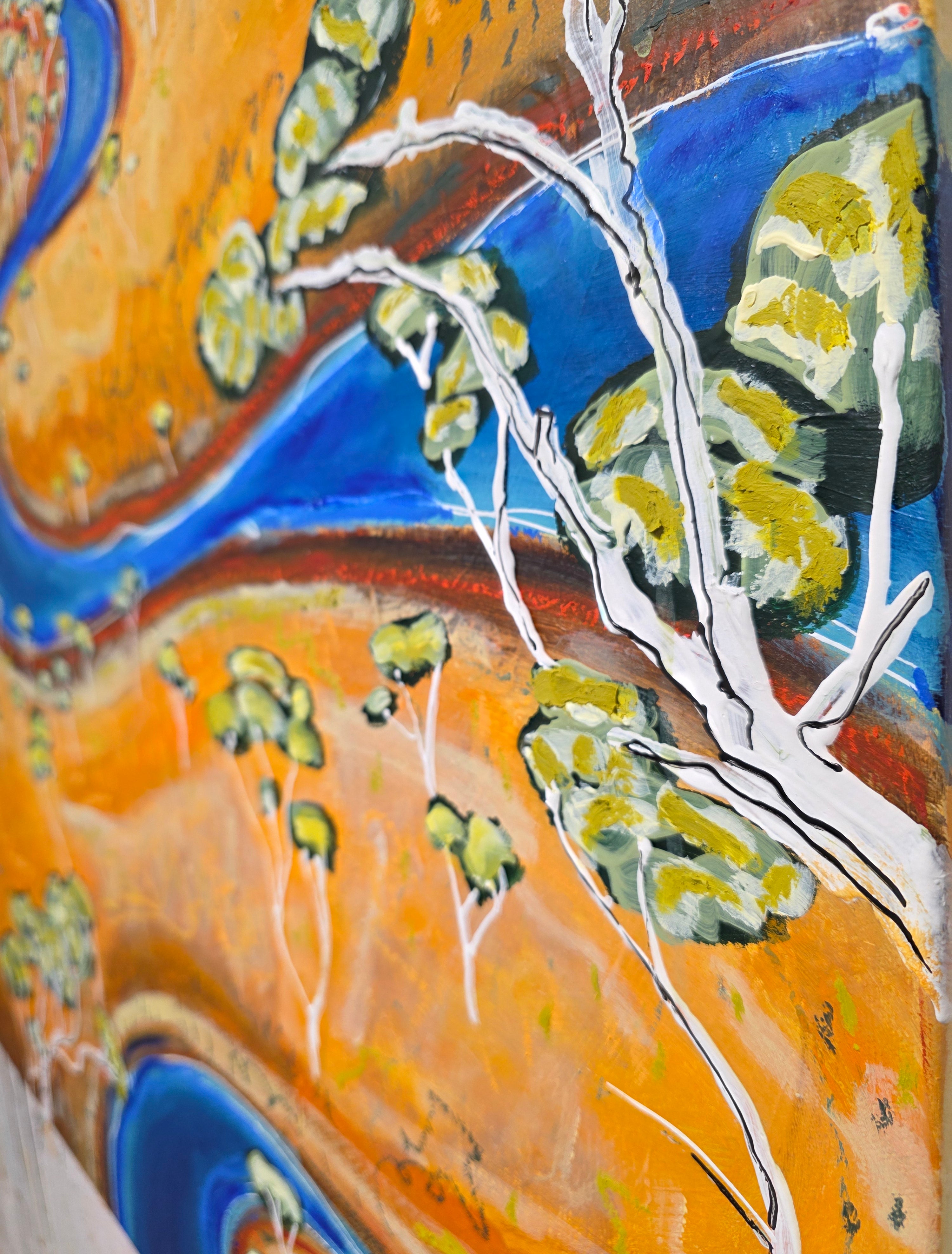I like to look at the shapes, colours, textures and patterns that I find in nature. I find simplifying these down into naive and basic forms helps me to capture the essence and feel of a space around me better than any photograph can. Like many of my landscapes this is based on a river somewhere towards the Blue Mountains. I like looking at how the water carves its way through the land around it, and i can always find beauty in the patterns and textures in the trees in the places I explore. It's this I have tried to capture here.