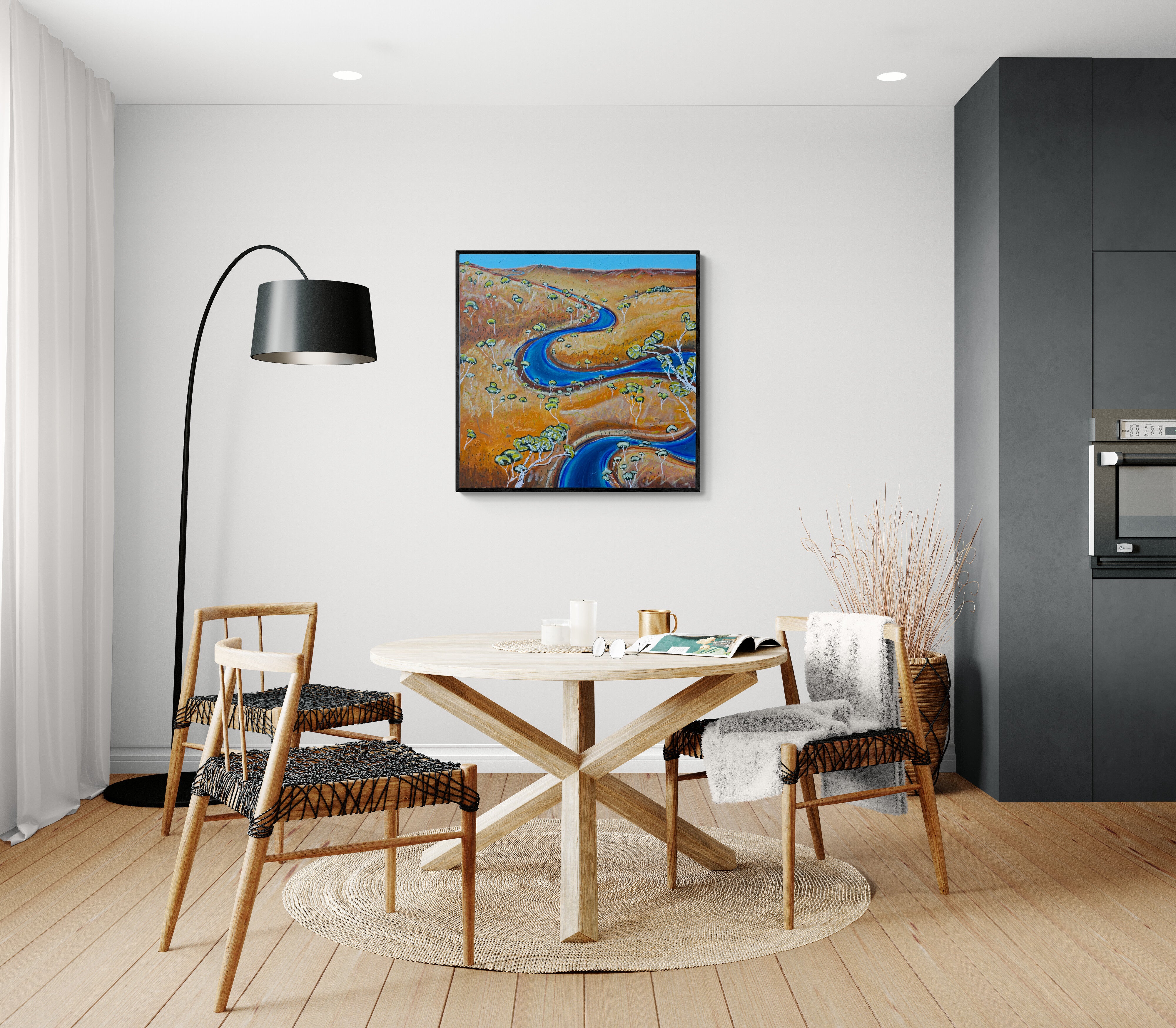 94 x 94cm | Acrylic and oil stick on canvas | Framed in black stained timber | Ready to hang