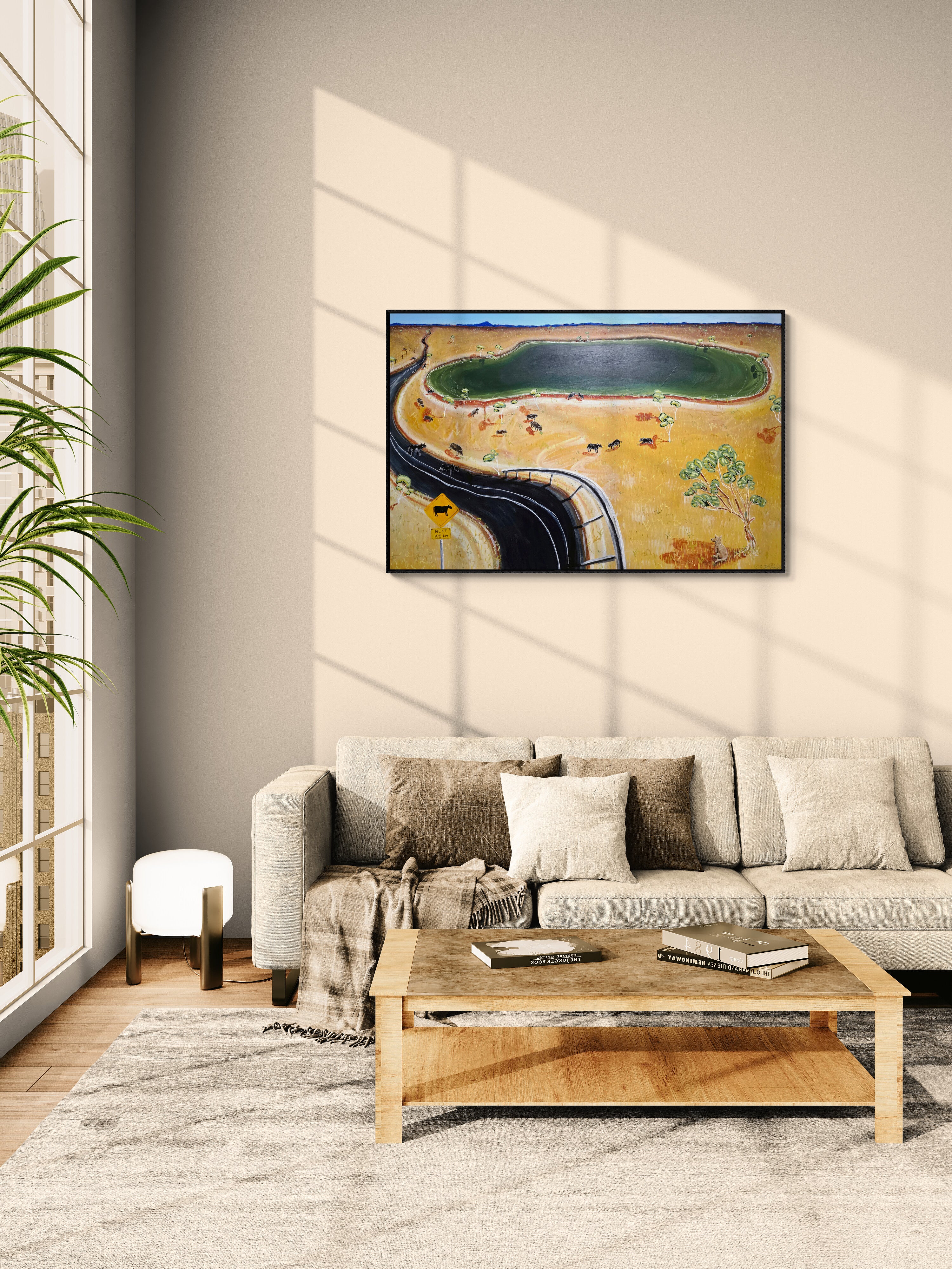155 x 105cm. Acrylic & Oil stick on canvas, framed in timber (black stain).