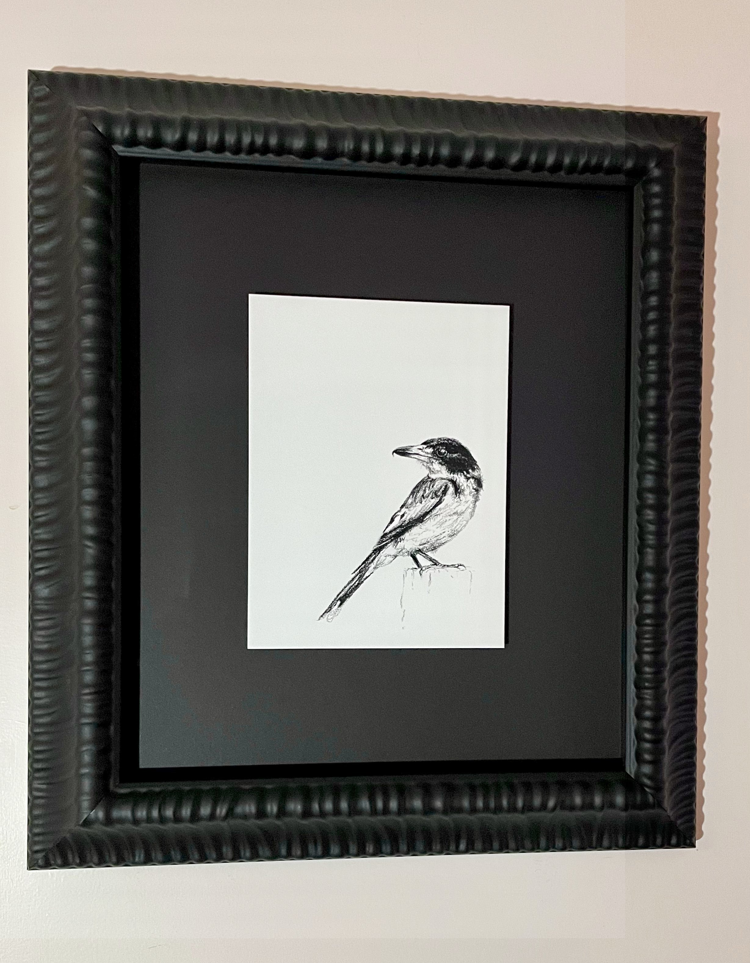 46 x 40cm. Charcoal sketch on 100% cotton vellum. Framed in Black Italian Moulding
