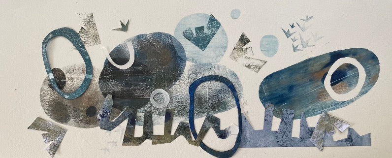This work shows a multiple of disciplines from printing to collage. Blue hues and organic shapes cone together and tumble through this reimagined rock scape.