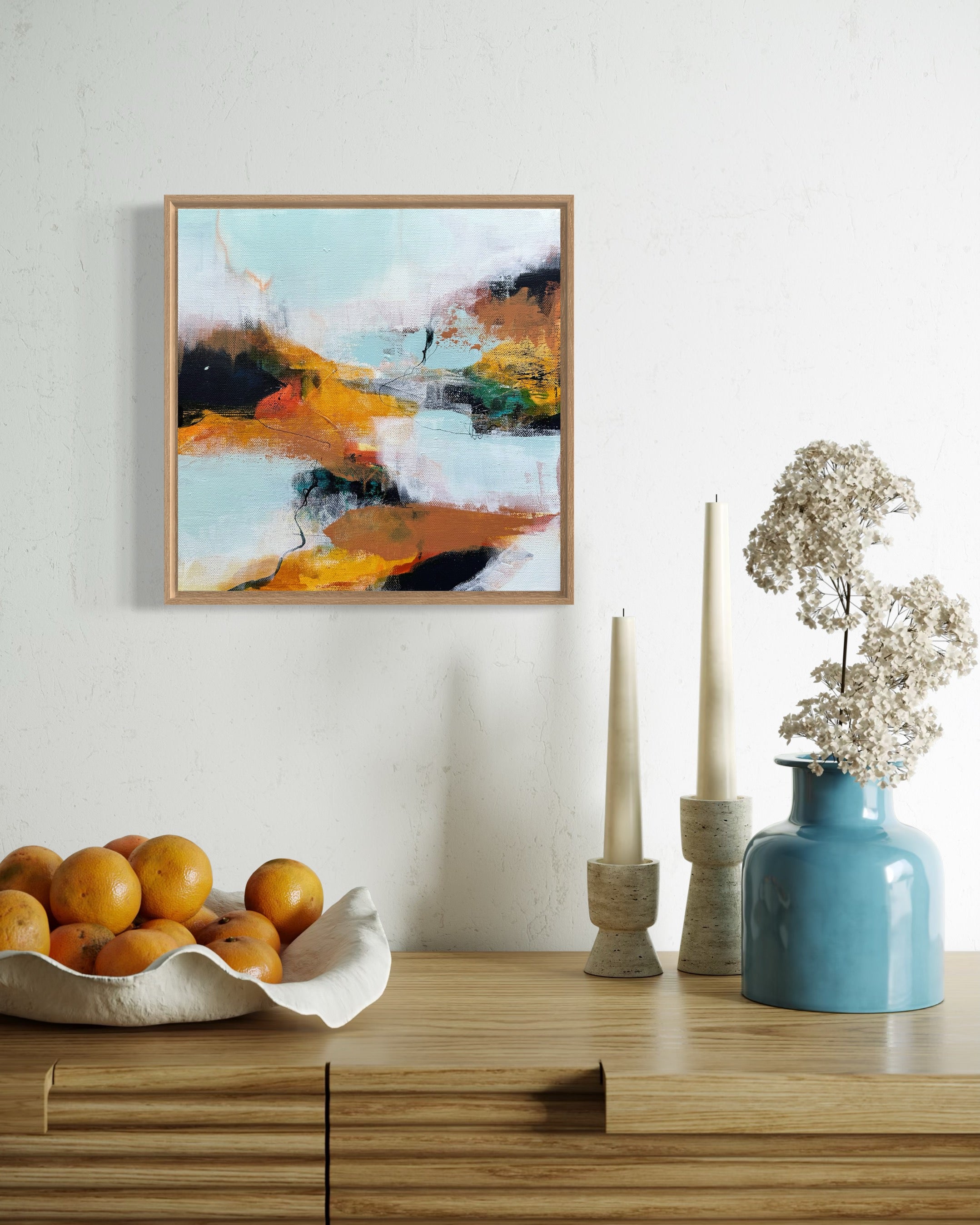 34.5 x 34.5cm. Acrylic on canvas, framed in oak.